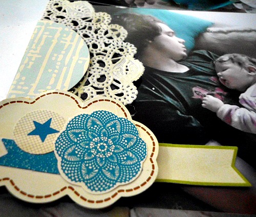 The green wood grain paper is from American Crafts/Amy Tangerine. The pattern paper that the stars (and center of doilies) are made of is actually from American Craft's Night Fall collection. You'd never guess that it had pumpkins on the other side of it! The water color-esque cloud border is from the On A Whimsy collection by Fancy Pants Designs. The dark teal border strip was punched out of coordinating paper from the Happy Days collection by Echo Park using a Martha Stewart Scallop Dot punch. I cut the clouds at the top out of paper from Echo Park's Summer Days collection.